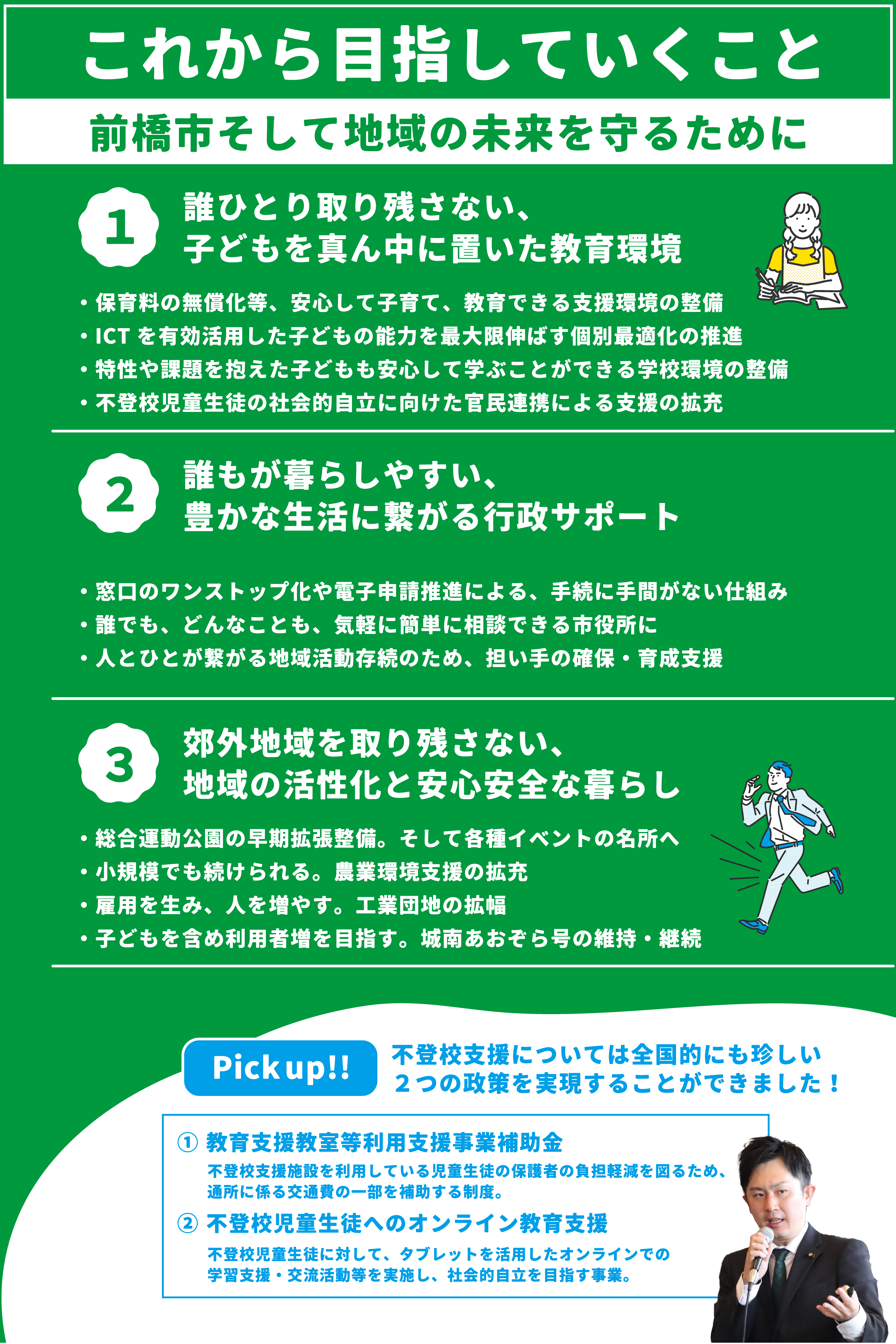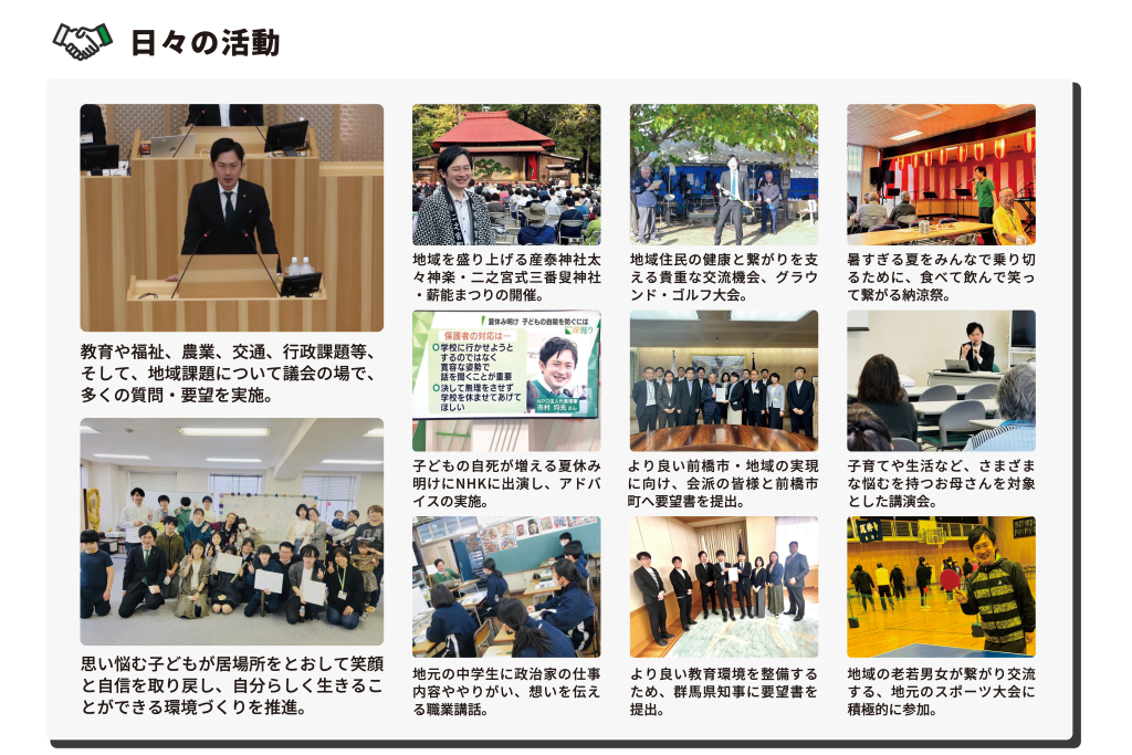 私が目指してきた 「子どもの教育機会の公平化」 「わかりやすく頼りやすい行政組織」 「社会に参画・所属する機会の提供」 については、若輩者ながら、 教育支援教室等利用支援事業補助金の創設など、 具体的な政策を実現することができました。 また、 地域課題である道水路の整備や危険箇所の改修、子どものいじめや不登校に関する保護者からの相談対応にも努めてまいりました。